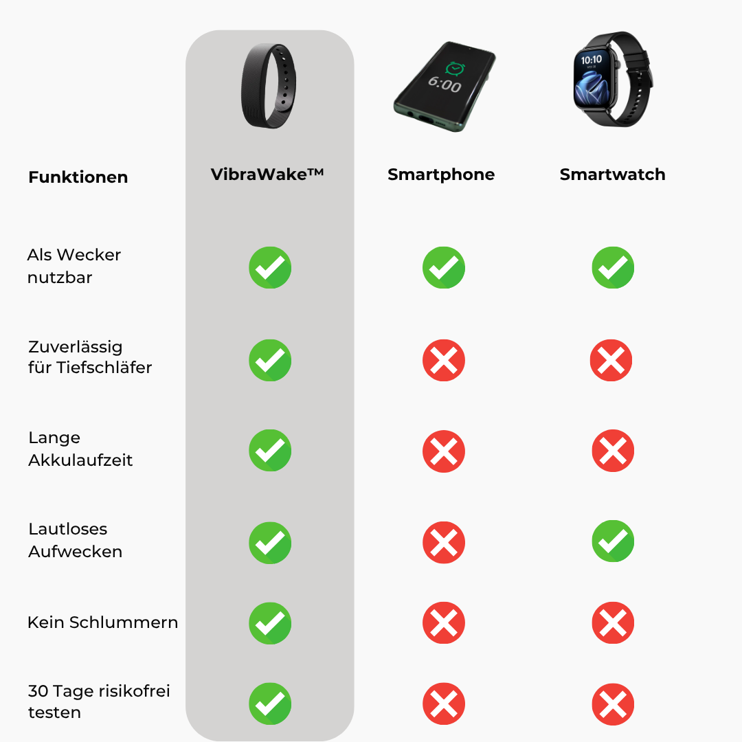 Nein. VibraWake™ funktioniert komplett unabhängig. Du stellst den Alarm direkt am Gerät ein – ganz ohne Smartphone, App oder störende Strahlung.